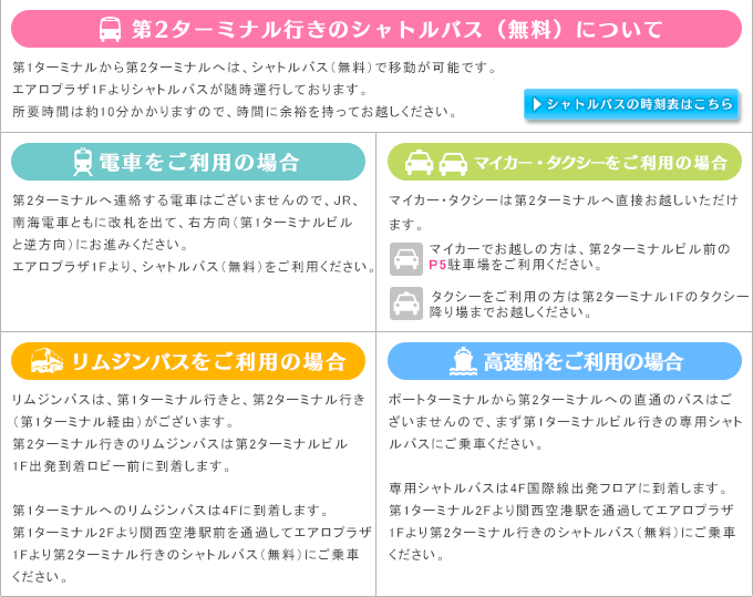 2012年10月28日より、Peachは全便、第2ターミナルへ移動しました。 第2ターミナルへは、無料シャトルバスにて約10分かかります。 空港へは時間に余裕をもってお越しください。